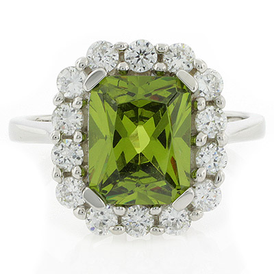 Peridoto en corte esmeralda aproximadamente de 4 quilates ( 11 mm x 8 mm) adornado con Zirconias incrustadas, elaborado con Plata de Ley .925 de alta calidad en un diseño único y con un acabado en Rodio para darle un toque de oro blanco a este Anillo.