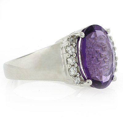 Amatista en corte ovalado aproximadamente de 8 quilates ( 15 mm x 11 mm) adornado con Zirconias incrustadas, elaborado con Plata de Ley .925 de alta calidad en un diseño único y con un acabado en Rodio para darle un toque de oro blanco a este Anillo.